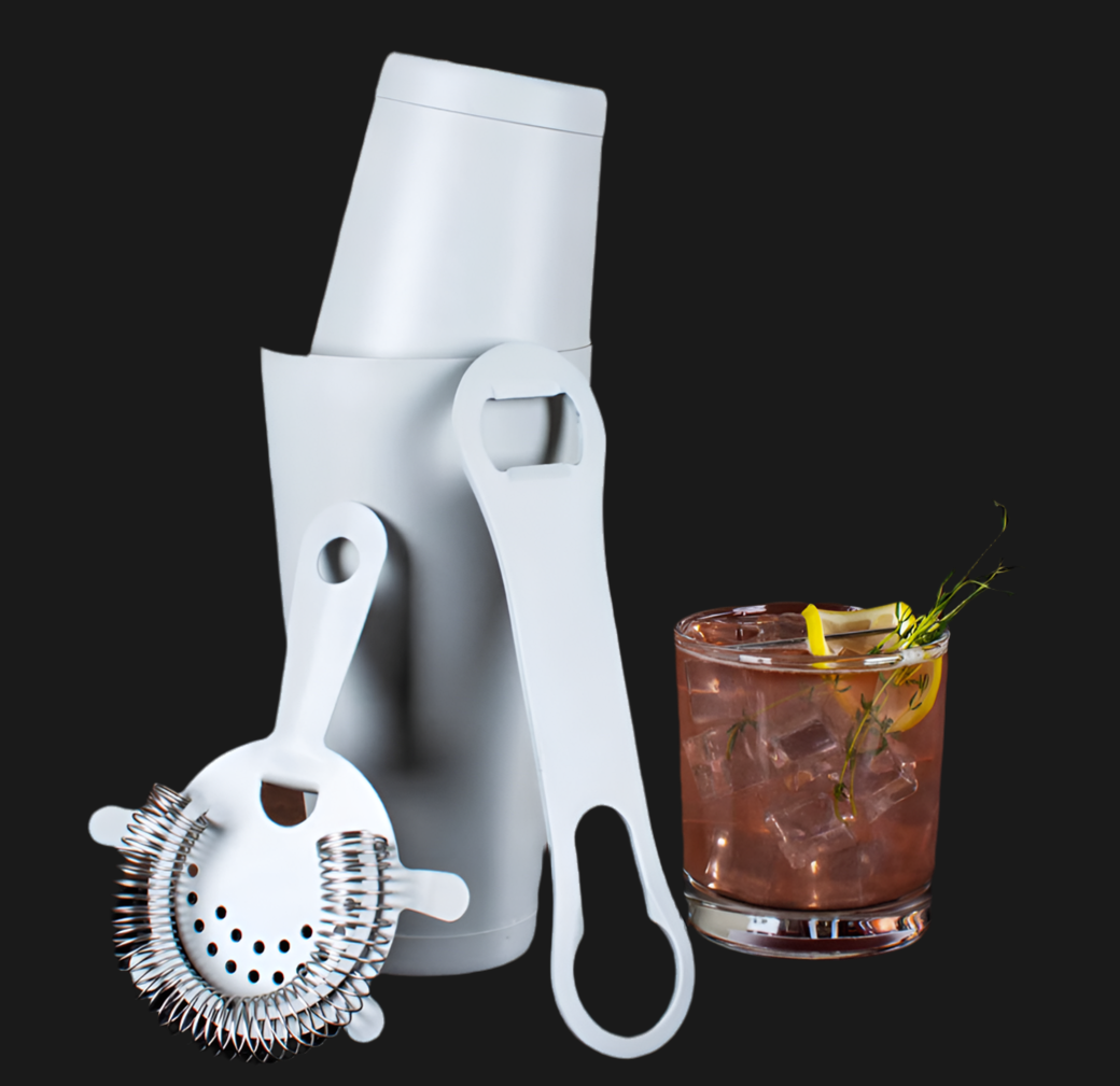This sleek, modern bar kit features a premium matte finish on durable stainless steel, built to handle everything from a chilled Margarita to a blazing B-52. The set includes both a 28 oz and 18 oz shaker tin that fit perfectly together for seamless mixing, a reliable 4-prong cocktail strainer for clean pours, and a powerful V-Rod® bottle opener for quick access to bottled ingredients.