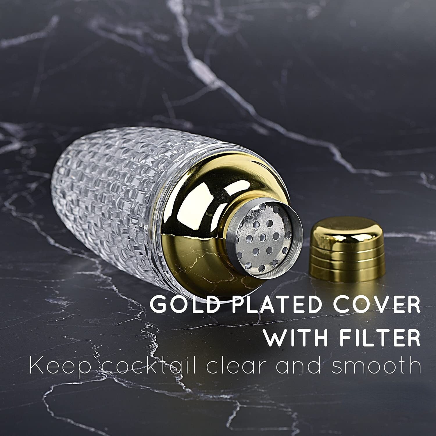 Luxury Glass: Premium thick clear glass cocktail shaker set with a metallic stainless steel lid. Gold, rose gold and silver available.