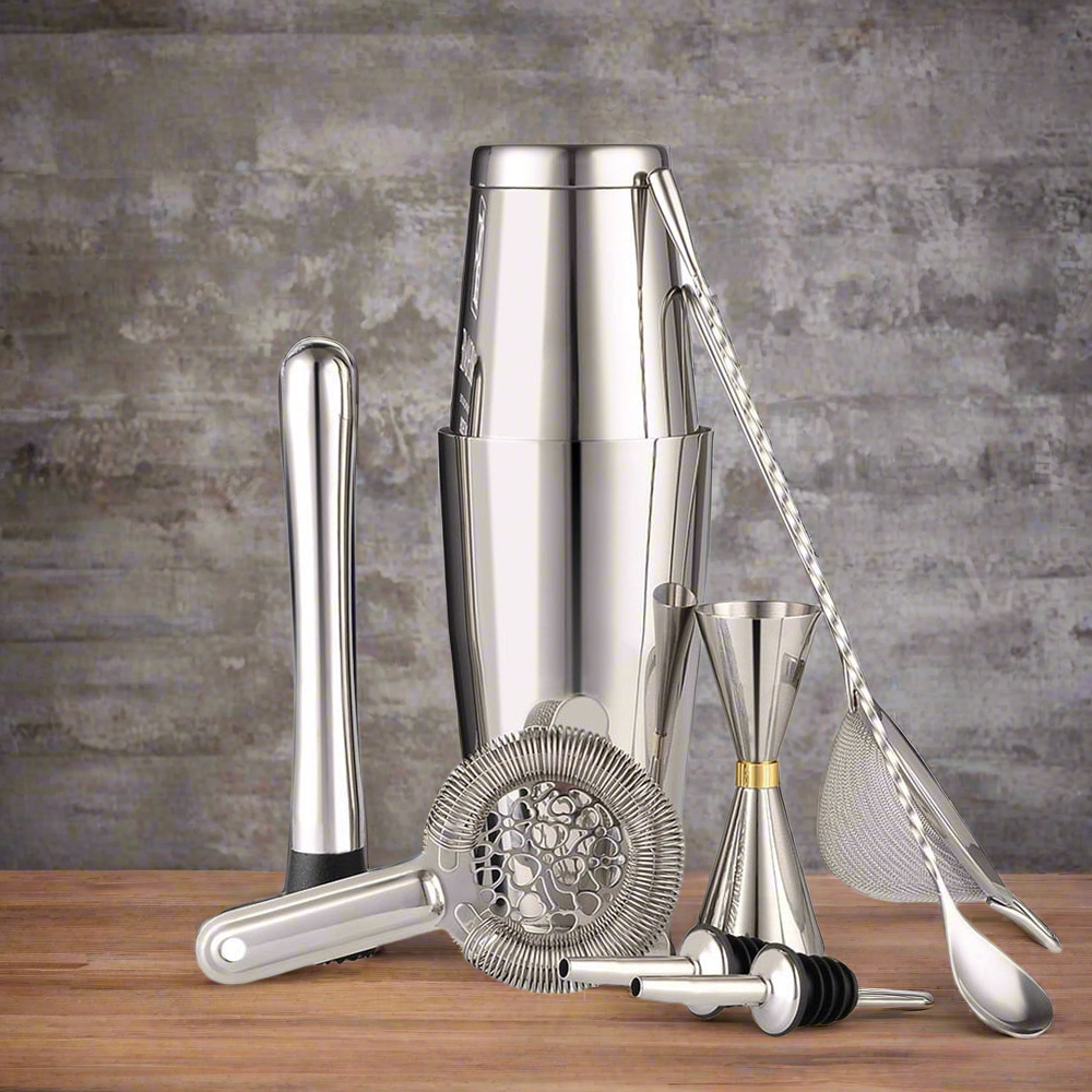 Muddler: The muddler is included for mashing and extracting flavores from fruits, herbs, or spices, essential for crafting cocktails like mojitos and old fashioneds.