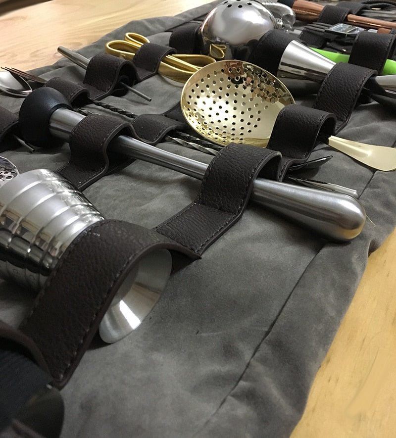 The Roll-Out PU Leather Mixology Bag: is a stylish and functional accessory designed to carry essential barware for bartenders and cocktail enthusiasts. Crafted from high-quality PU leather, the bag features multiple compartments and pockets to neatly organize and protect various bar tools.